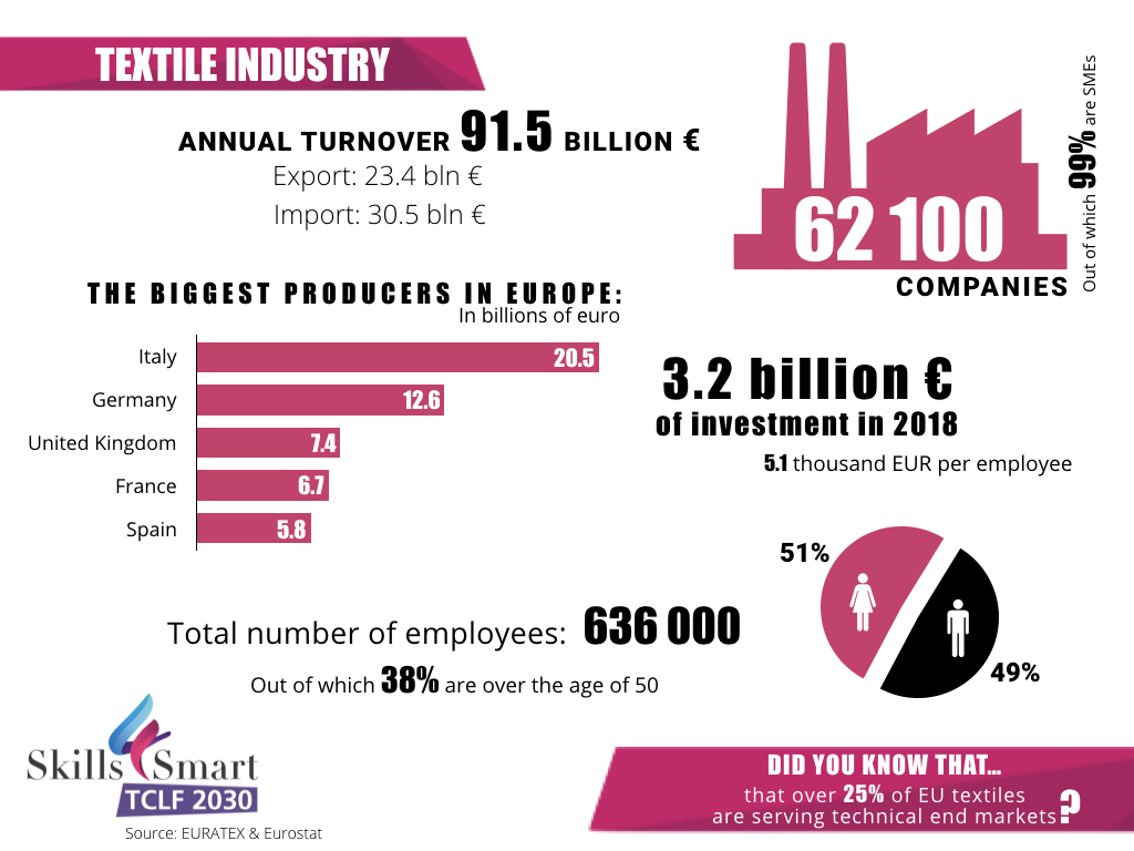 The textile industry in Europe covers a wide range of products and processes such as spinning, weaving, and finishing of textiles, manufacture of knitted and crocheted fabrics followed by the production of carpets, ropes, nettings, but also industrial and technical textiles. The last category today represents 25% of the total turnover of the sector. This broad use of the product indicates that although the clothing industry is still the biggest customer of the textile sector it’s not the only destination of produced goods and components.